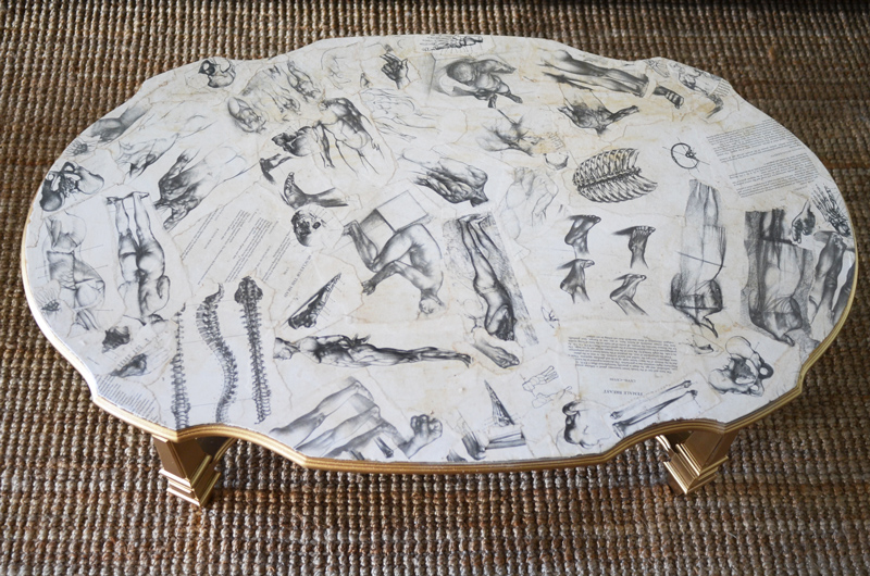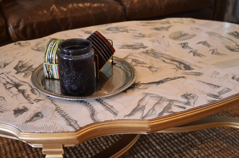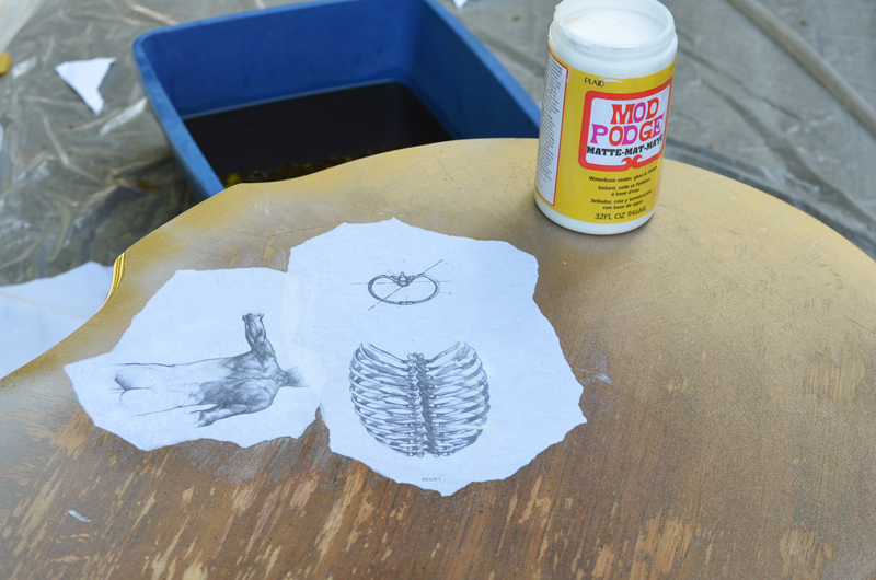 --τραπέζι σας και ψεκάστε τα πόδια με λευκό σπρέι βαφής αστάρι έτσι ώστε το χρώμα να έχει τέλει όψη. Αφού στεγνώσει το αστάρι σας, ψεκάστε τα πόδια του τραπεζιού σας με το χρώμα που σας αρέσει. Κάντε λίγο καφέ σε μια λεκάνη και να μουλιάστε σε αυτό τις εικόνες που θέλετε να τοποθετήσετε στο τραπέζι σας. Χρησιμοποιώντας το αφρώδες πινέλο σας, απλώστε ένα στρώμα λευκή κόλλα στο πίσω μέρος του κάθε κομματιού του χαρτιού σας και απλώστε τα πάνω στο τραπέζι. Όταν είναι ξηρό, χρησιμοποιήστε ένα ξυράφι ή μια λεπίδα για να κόψετε προσεκτικά τις άκρες. Βάψτε 1 – 2 στρώσεις πολυακρυλικό προστατευτικό φινίρισμα πάνω στο τραπεζί σας για να δέσει ο σχεδιασμός σας, αφήστε να στεγνώσουν και απολαύστε το πραγματικά καταπληκτικό έργο σας.
